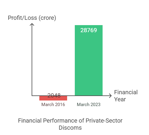 While the losses of the state-sector discoms increased from Rs 3.74 lakh crore in 2016 to Rs 6.76 lakh crore in 2023, the private-sector discoms went from Rs 2,048 crore losses as of March 2016 to Rs 28,769 crore profit of March 2023.Tata Power Delhi reduced AT&C losses from 53% (pre-privatization) to 7.25% by FY23, achieving consistent profitability. Torrent Power and CESC have also maintained profitability through efficient operations and lower losses.